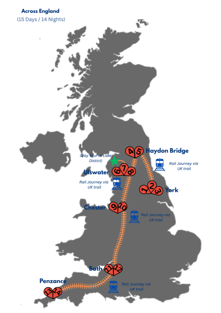 This rail tour of England is designed to begin with a scenic journey from London to the historic city of York, though we can easily tailor the itinerary to suit your schedule, preferred destinations, or arrival airport. Along the way, you’ll travel in comfort through charming countryside and vibrant cities, with the opportunity to visit iconic landmarks, enjoy guided excursions, and experience authentic local culture. Whether you start in London, Manchester, or elsewhere, your adventure will lead you to one of the UK’s most captivating and historically rich destinations.