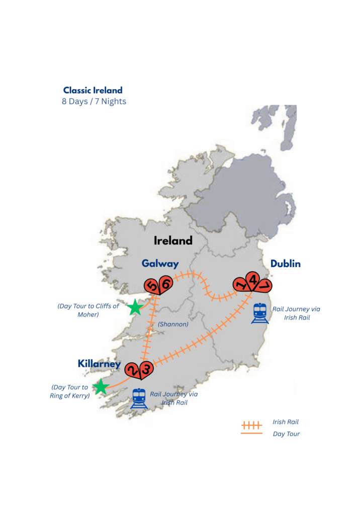 Explore Ireland by train over six days, from Dublin’s historic sites to the Ring of Kerry and Cliffs of Moher. Enjoy scenic train rides through breathtaking landscapes, coastlines, and landmarks.
