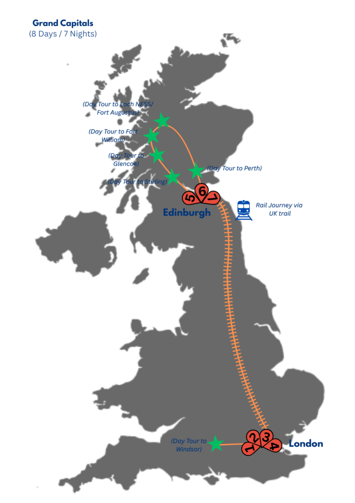 Explore two capitals in one rail adventure! Discover London’s landmarks, royal sites, and Thames cruise, then ride to Edinburgh for historic charm, hills, and natural beauty.