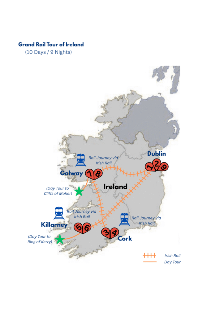 Explore Ireland’s charm, from Dublin’s vibrancy to the Cliffs of Moher and the Ring of Kerry. Enjoy scenic rail journeys and guided tours to top attractions in Dublin, Cork, Killarney, and Galway for an unforgettable adventure.