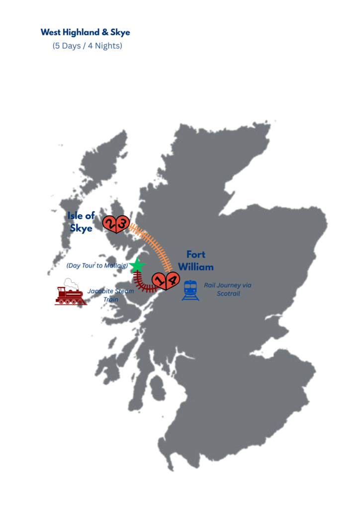 After breakfast, enjoy a first-class journey on the iconic Jacobite Steam Train from Fort William to Mallaig, crossing the legendary Glenfinnan Viaduct and soaking in more of the Highlands’ breathtaking scenery along the way. Upon arrival in Mallaig, board the ferry for a scenic crossing to the southern shores of the Isle of Skye.