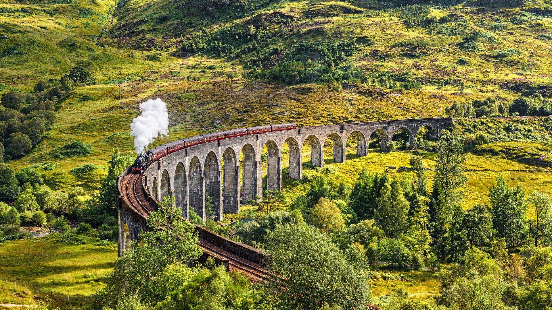 Relax and enjoy the stunning scenery on the West Highland Line from Glasgow to Fort William. Ride the Jacobite Express through breathtaking landscapes to Mallaig, then take a scenic ferry crossing “over the sea to Skye.”