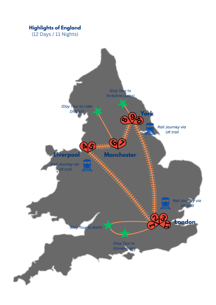 Discover England on a 12-day rail trip through London, Liverpool, Manchester, and York. Enjoy day trips to Stonehenge, Bath, the Lake District, and the Yorkshire Dales.