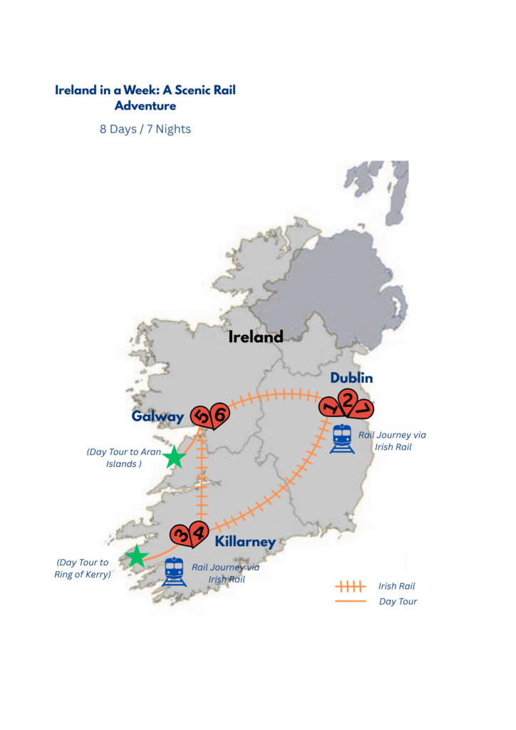 Discover Dublin, Kerry, and Galway on this 7-night rail adventure. Explore Dublin’s highlights, including the Book of Kells and Kilmainham Gaol, before journeying to the scenic Ring of Kerry and Ireland’s natural beauty.