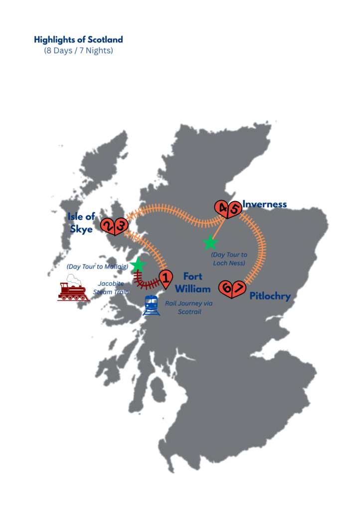 Experience Scotland’s best on an 8-day rail journey through majestic mountains, lochs, and historic towns. From Glasgow to the Isle of Skye, and on to Inverness and Pitlochry, enjoy iconic rail journeys and stunning natural beauty.