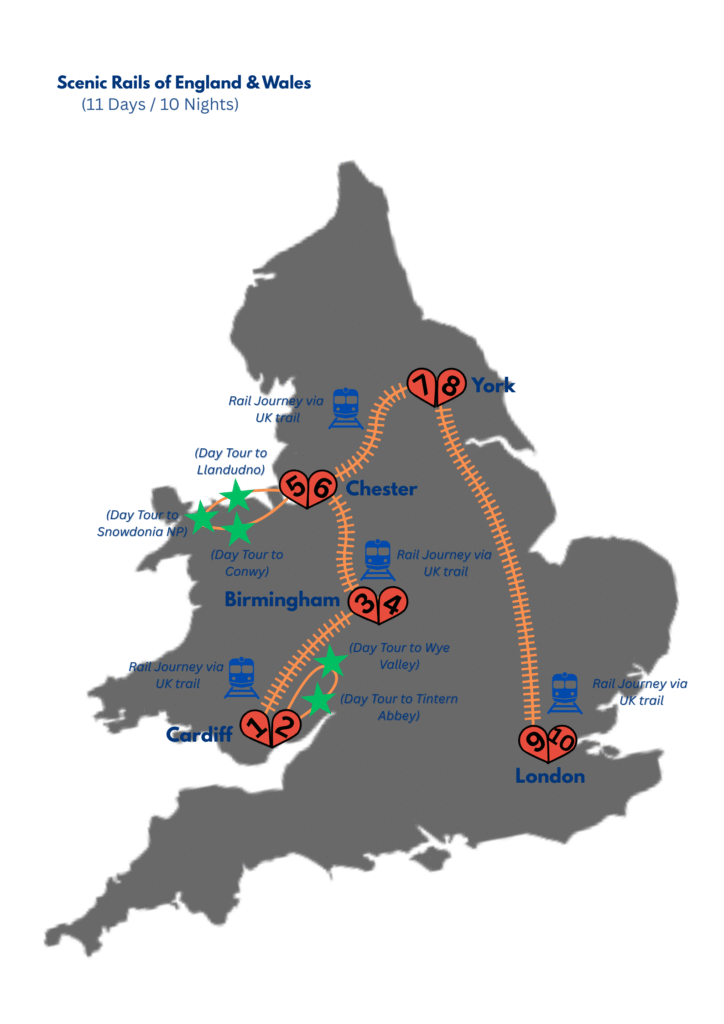 Enjoy scenic rail journeys through the Welsh borderlands and Yorkshire Dales with stays in Chester, York, and Cardiff, plus day tours in South Wales and Snowdonia.