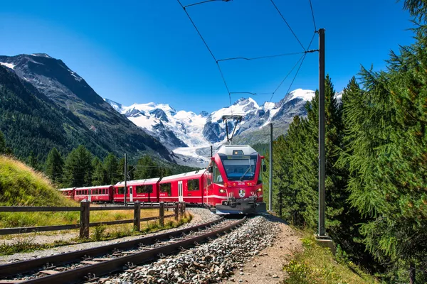 • Scenic train journey from Zurich to St. Moritz, passing alpine landscapes.
