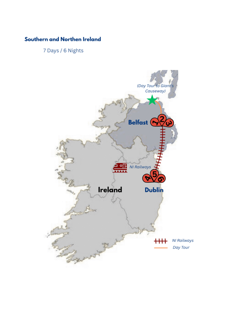 After travelling by train from Belfast to Dublin, take a leisurely walk to explore the city’s top attractions located near your hotel. Alternatively, enjoy some downtime with a visit to the bustling shopping districts in the city centre. Don’t forget to check with your travel consultant about any theatre performances that may be running—Dublin is home to a vibrant arts scene with a variety of excellent shows to choose from.