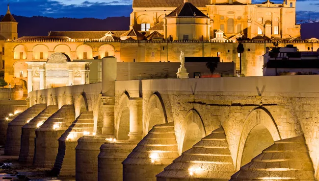 Travel by train to Córdoba and settle in for a three-night stay. Explore the historic center, stroll across the Roman Bridge, and admire views of the Mezquita as evening falls over the city.